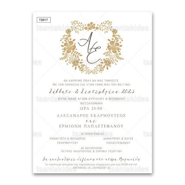 Προσκλητήριο Γάμου Μονογράμματα και Floral Χρυσό Στεφάνι
