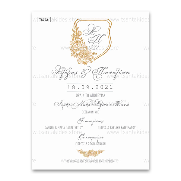 Προσκλητήριο γάμου με χρυσό λογότυπο και μονογράμματα