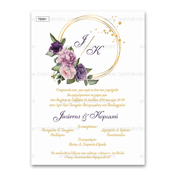 Προσκλητήριο γάμου με κυκλικό στεφανάκι, μοβ λουλούδια και χρυσές λεπτομέρειες