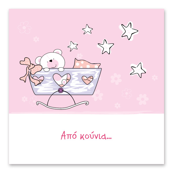 Προσκλητήριο βάπτισης με ροζ αρκουδάκι στην κούνια, σε τετράγωνο σχήμα. Τυπώνεται σε πολυτελές χαρτί και συνοδεύεται από φάκελο.