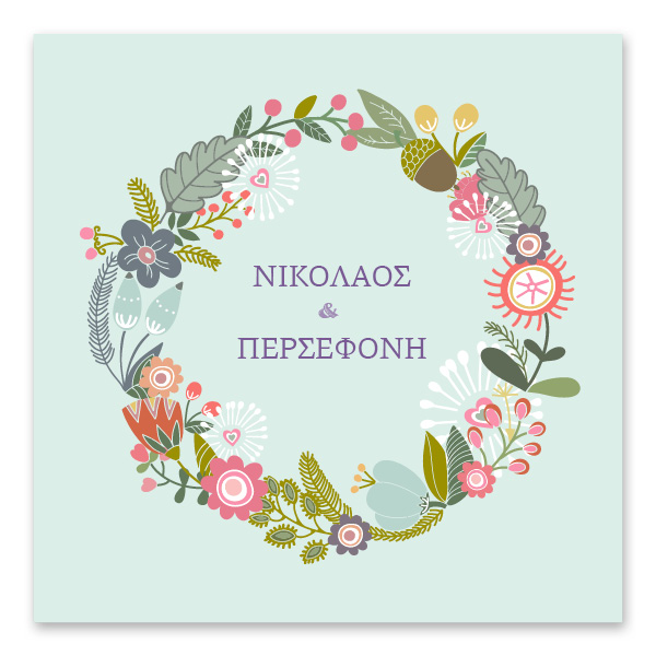 Καλλιτεχνικό προσκλητήριο γάμου με ανθισμένο στεφάνι, σε τετράγωνο σχήμα. Τυπώνεται σε πολυτελές χαρτί και συνοδεύεται από φάκελο.