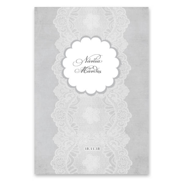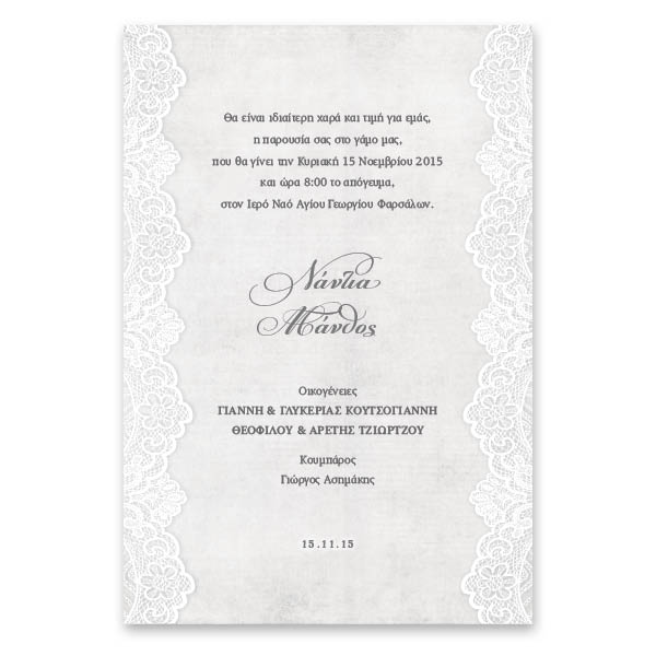 Γκρί κλασικό προσκλητήριο γάμου με δαντέλα, σε κάθετη διάταξη. Τυπώνεται σε πολυτελές χαρτί και συνοδεύεται από φάκελο.