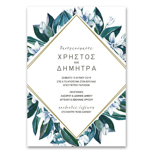 Πρόσκληση Γάμου Κλασική Κάθετη με Άνθη και Φύλλα