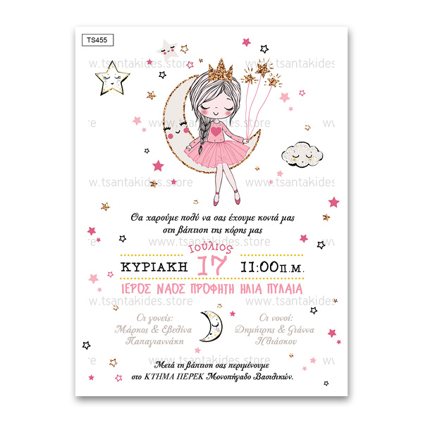 Πρόσκληση βάπτισης για κορίτσι με θέμα Girl On The Moon
